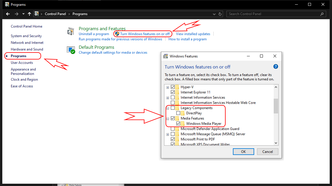 Figure 1. Enabling Legacy Components and Media Features in Windows